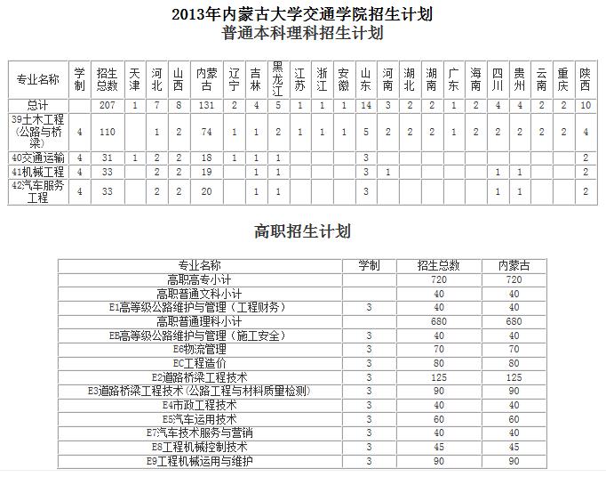 2013年內(nèi)蒙古大學(xué)交通學(xué)院招生計劃 普通本科理科招生計劃